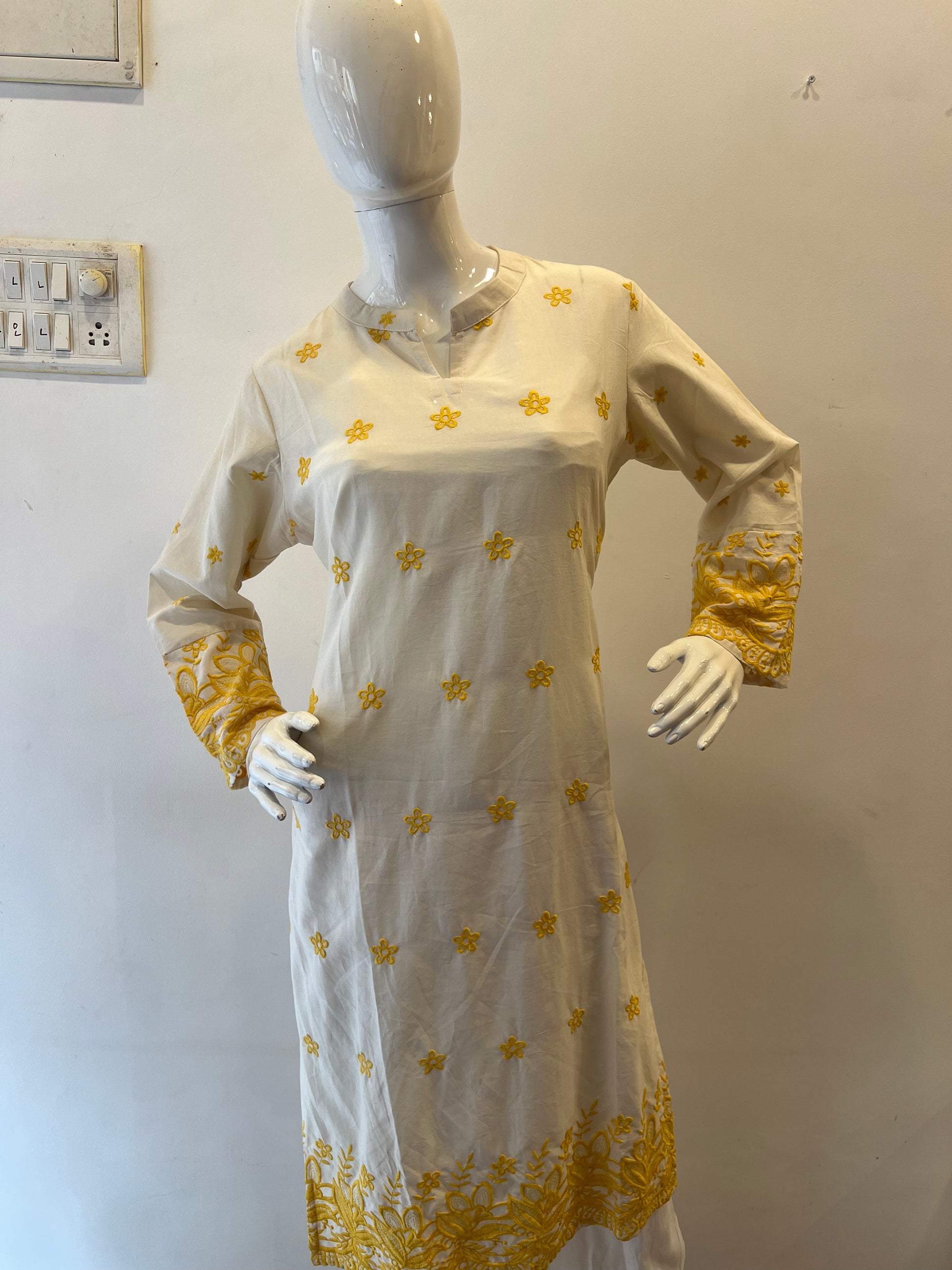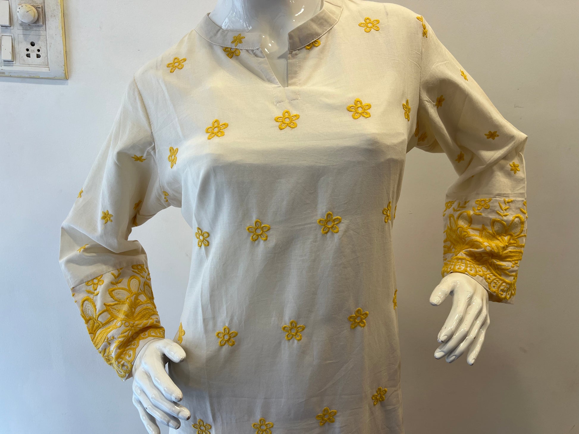 A beautifully crafted kurti featuring delicate floral embroidery on soft, breathable fabric. Designed with full sleeves and a notched neckline, this piece blends traditional elegance with modern simplicity. Perfect for casual outings, workwear, or festive occasions.