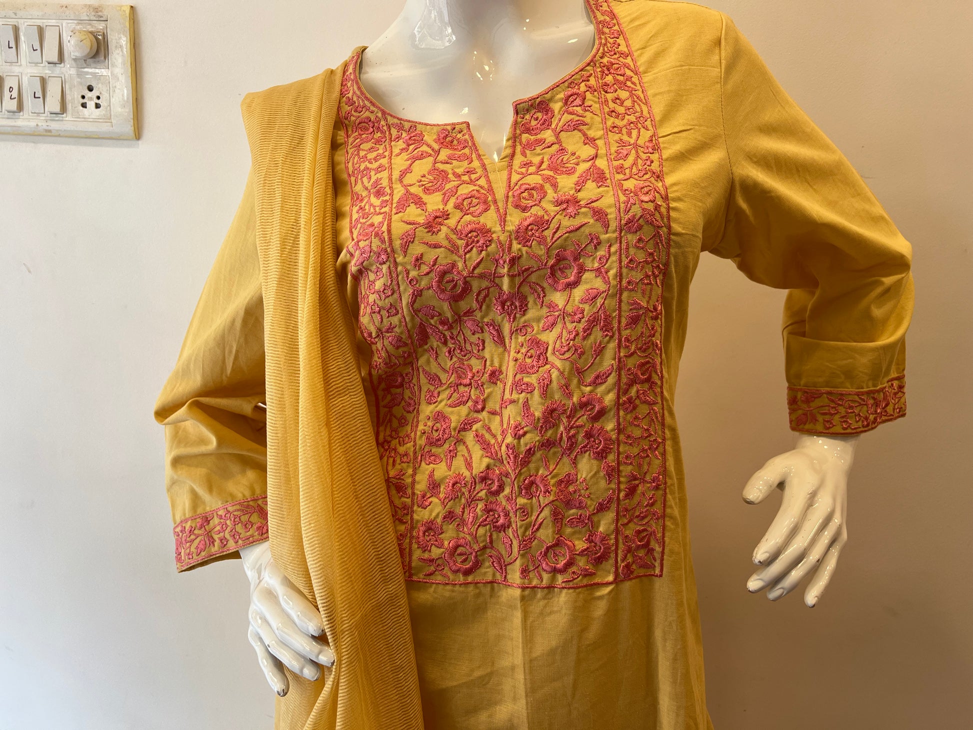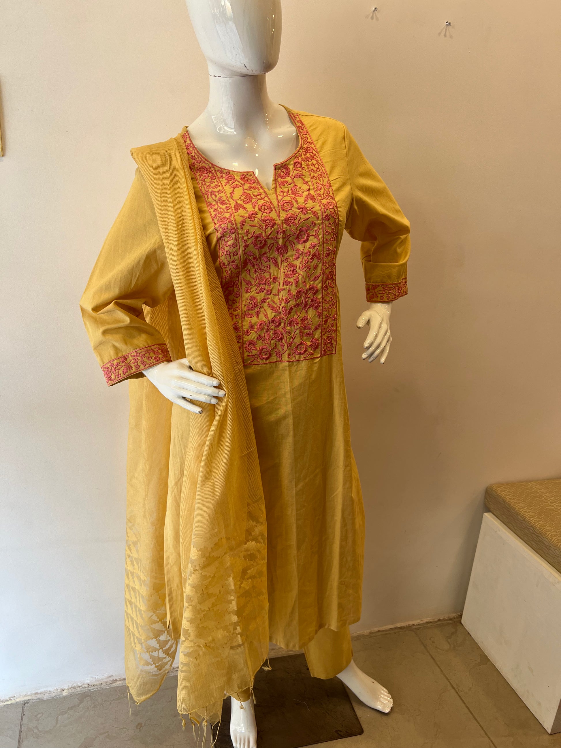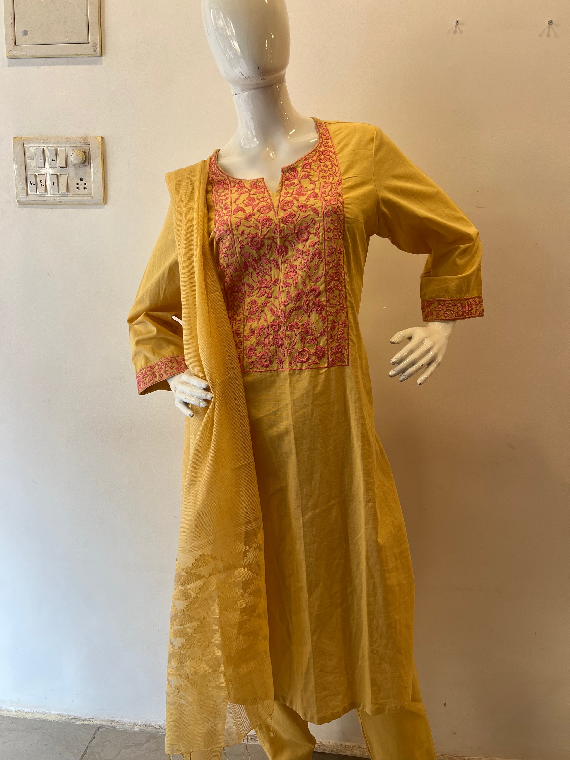 This sophisticated ensemble showcases exquisite floral embroidery on a radiant mustard canvas, featuring a beautifully detailed kurta paired with matching bottoms and dupatta for a complete traditional look.