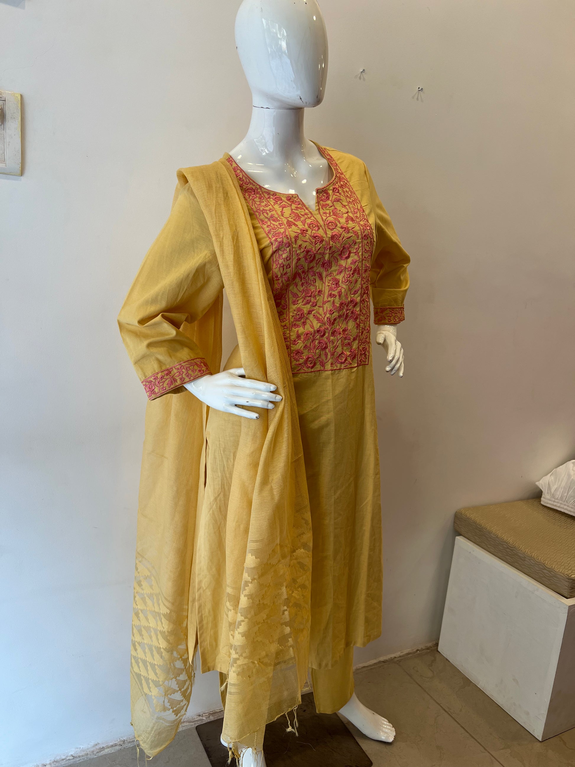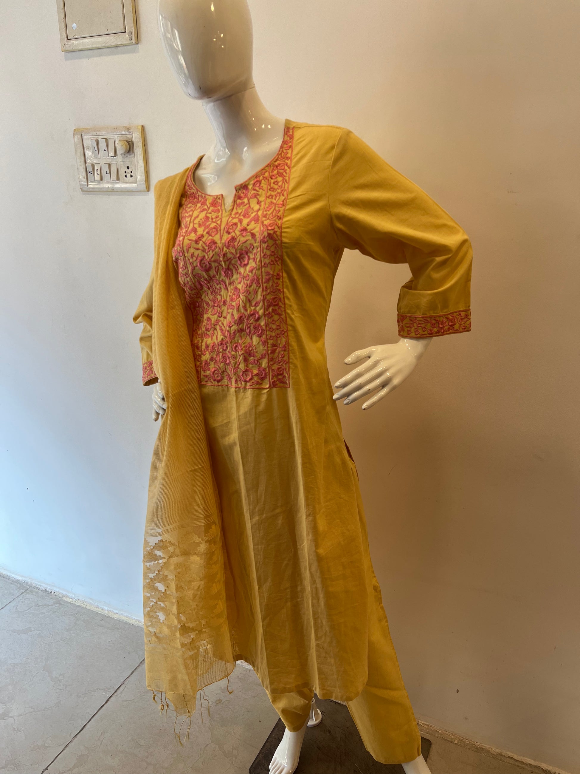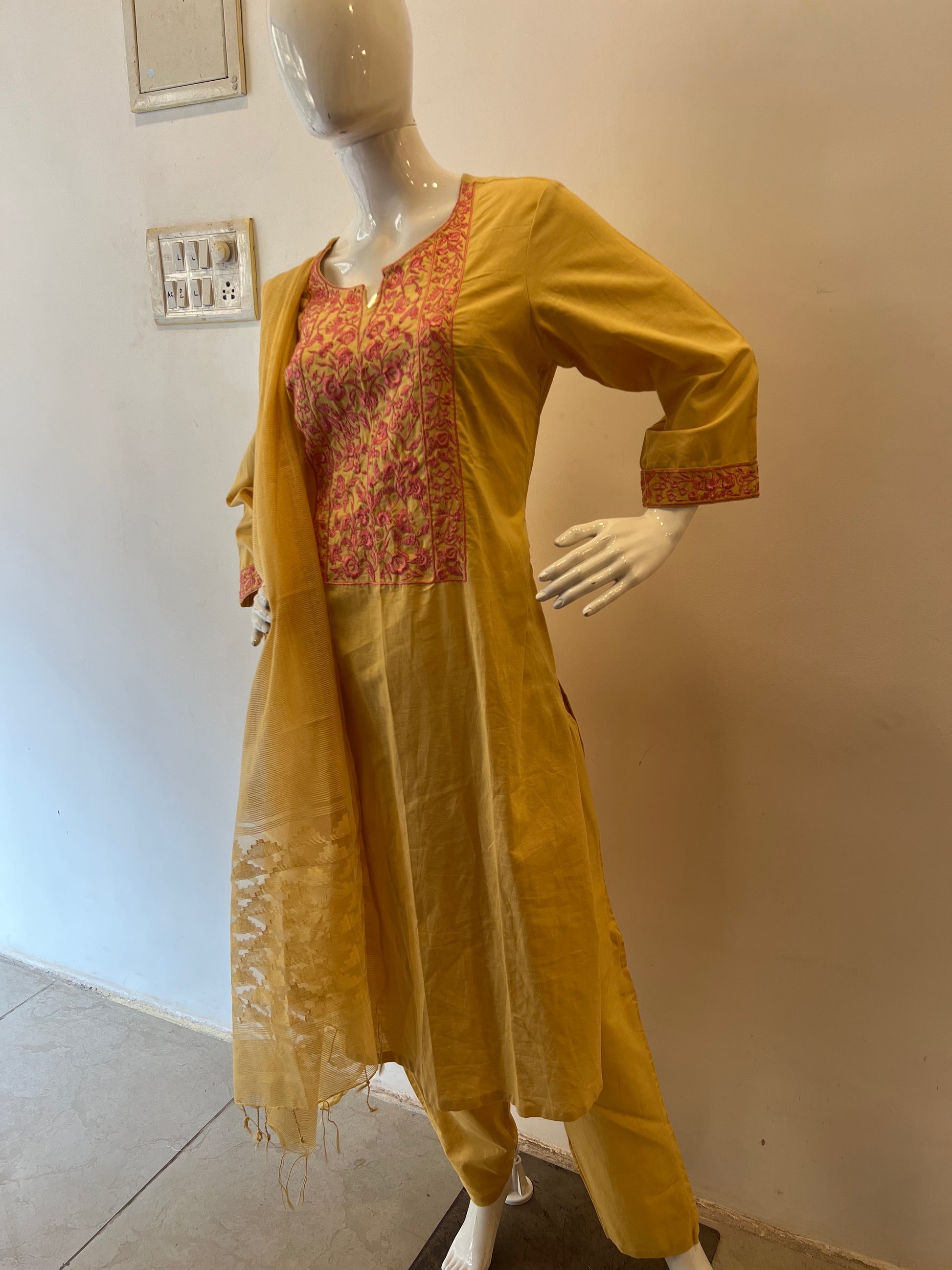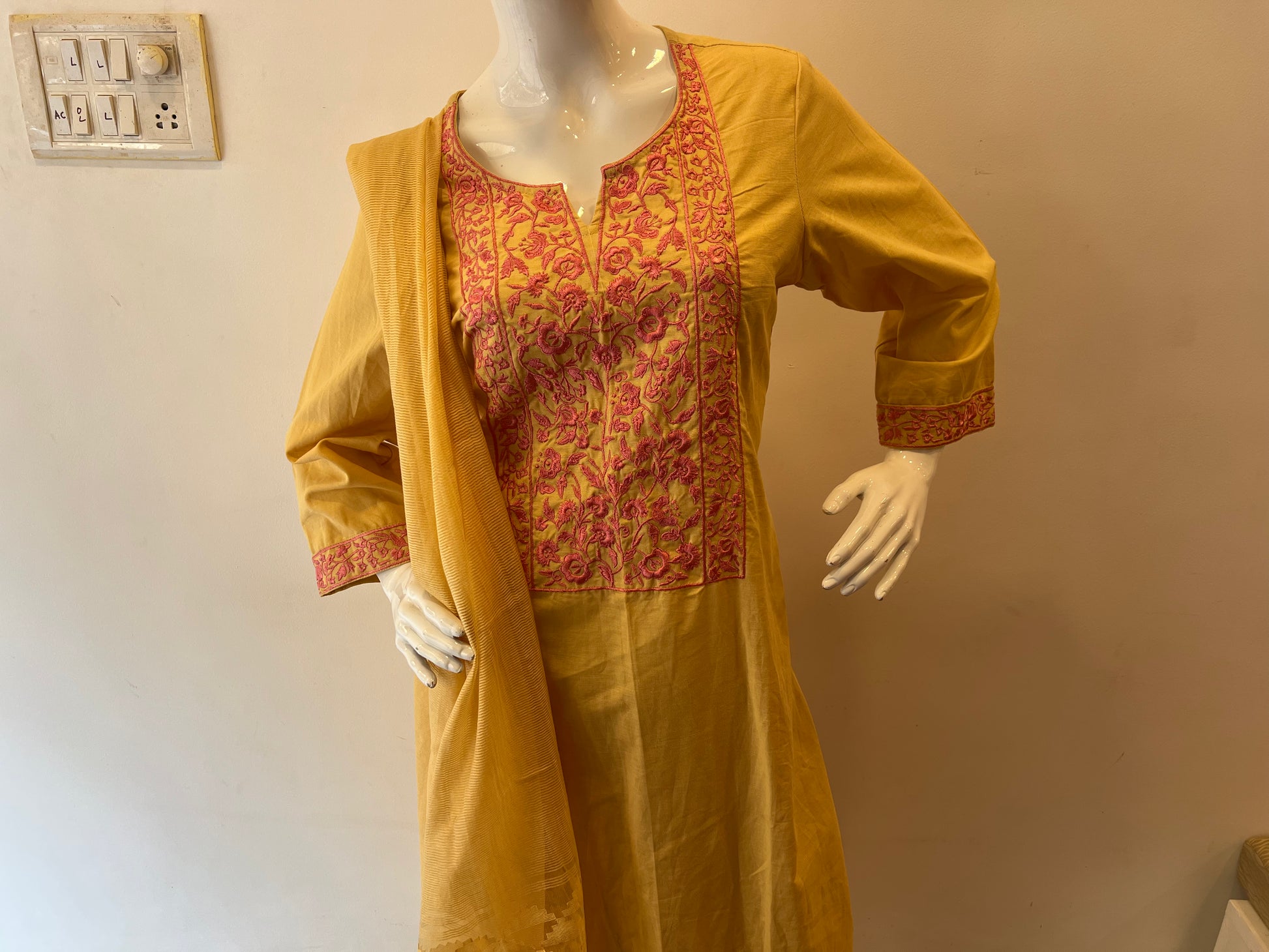 This sophisticated ensemble showcases exquisite floral embroidery on a radiant mustard canvas, featuring a beautifully detailed kurta paired with matching bottoms and dupatta for a complete traditional look.