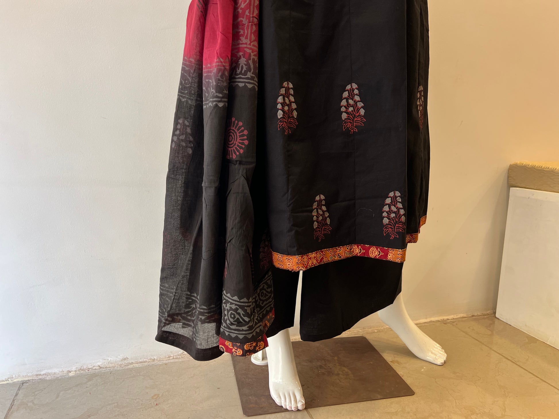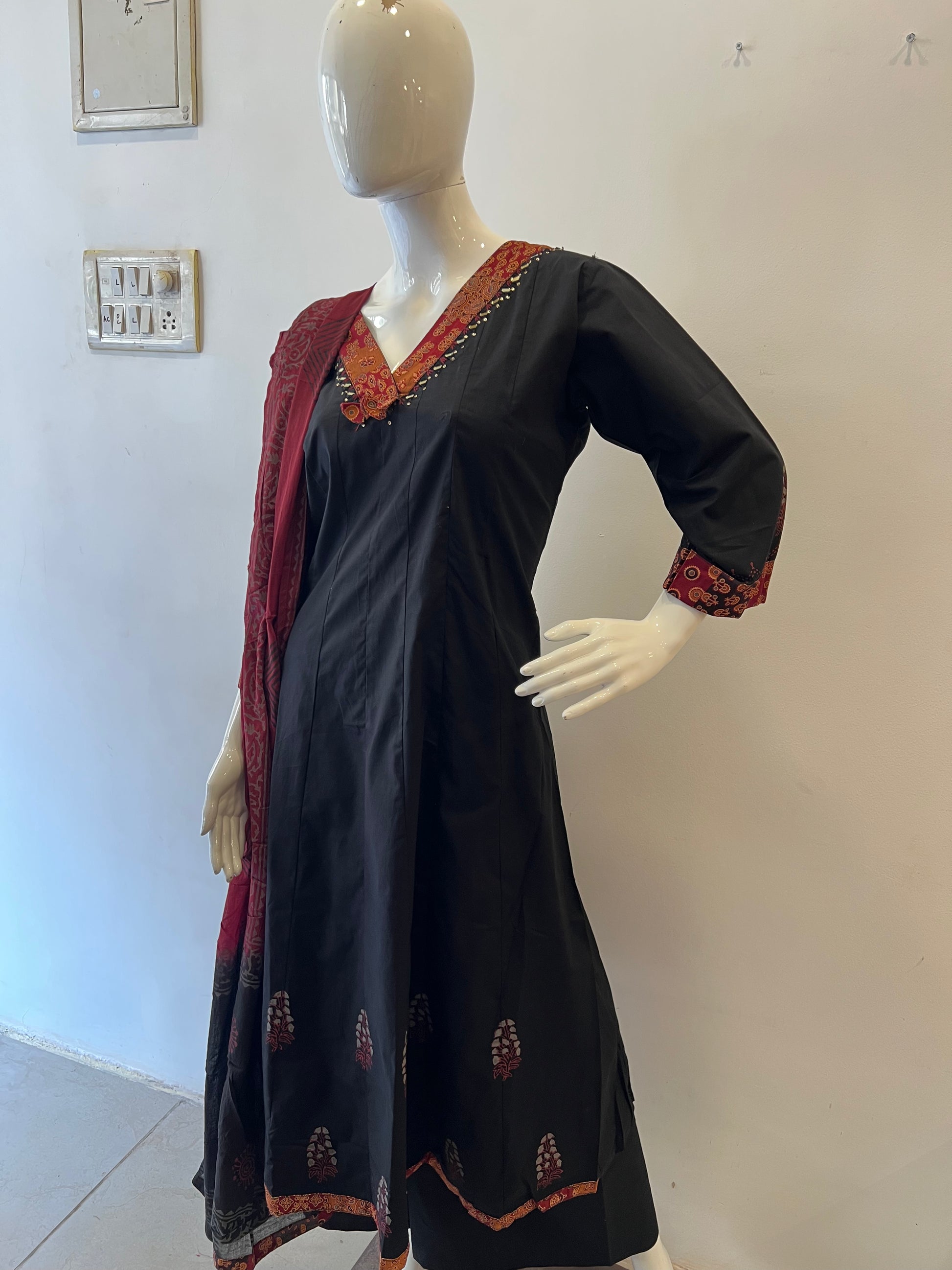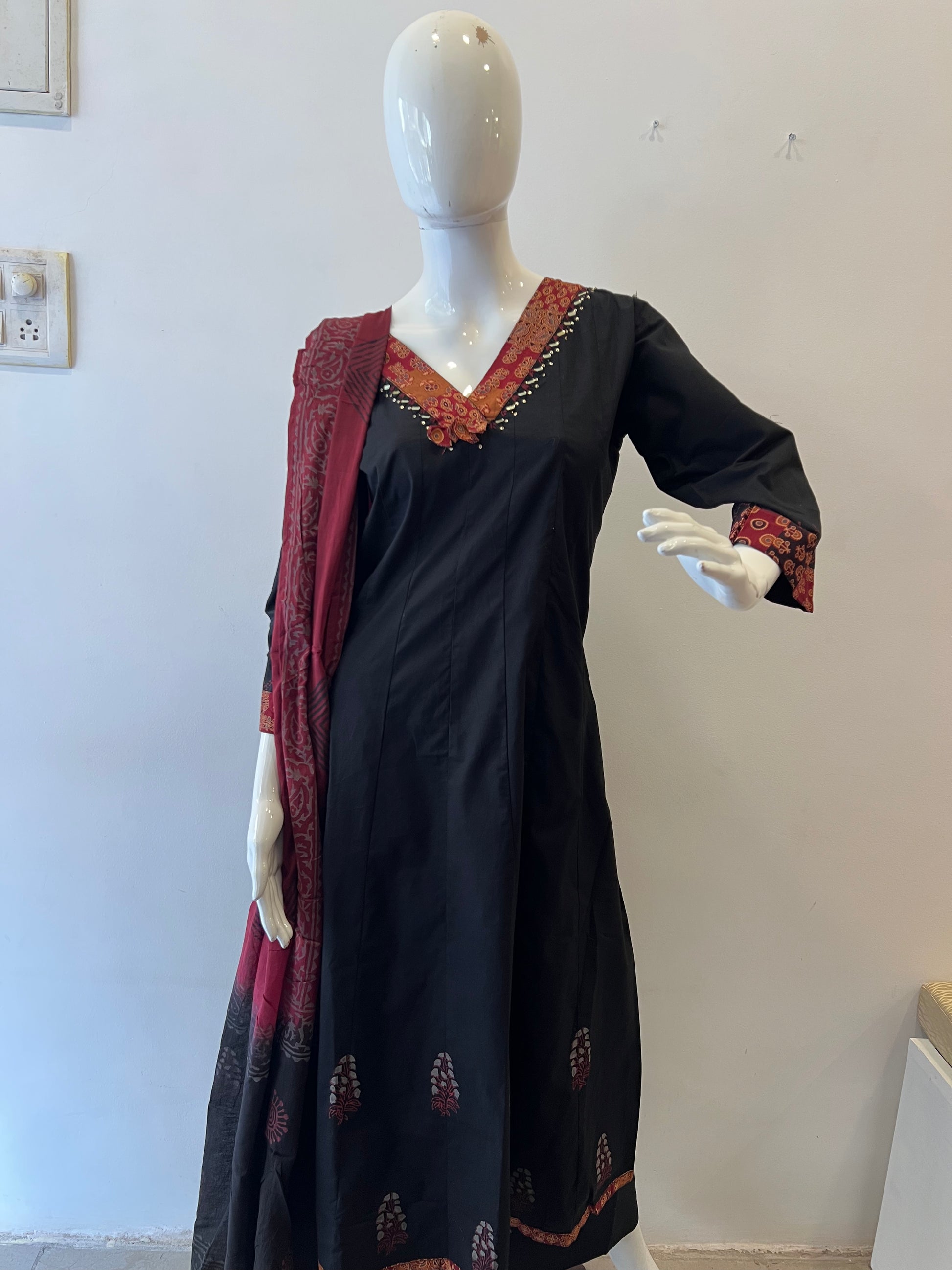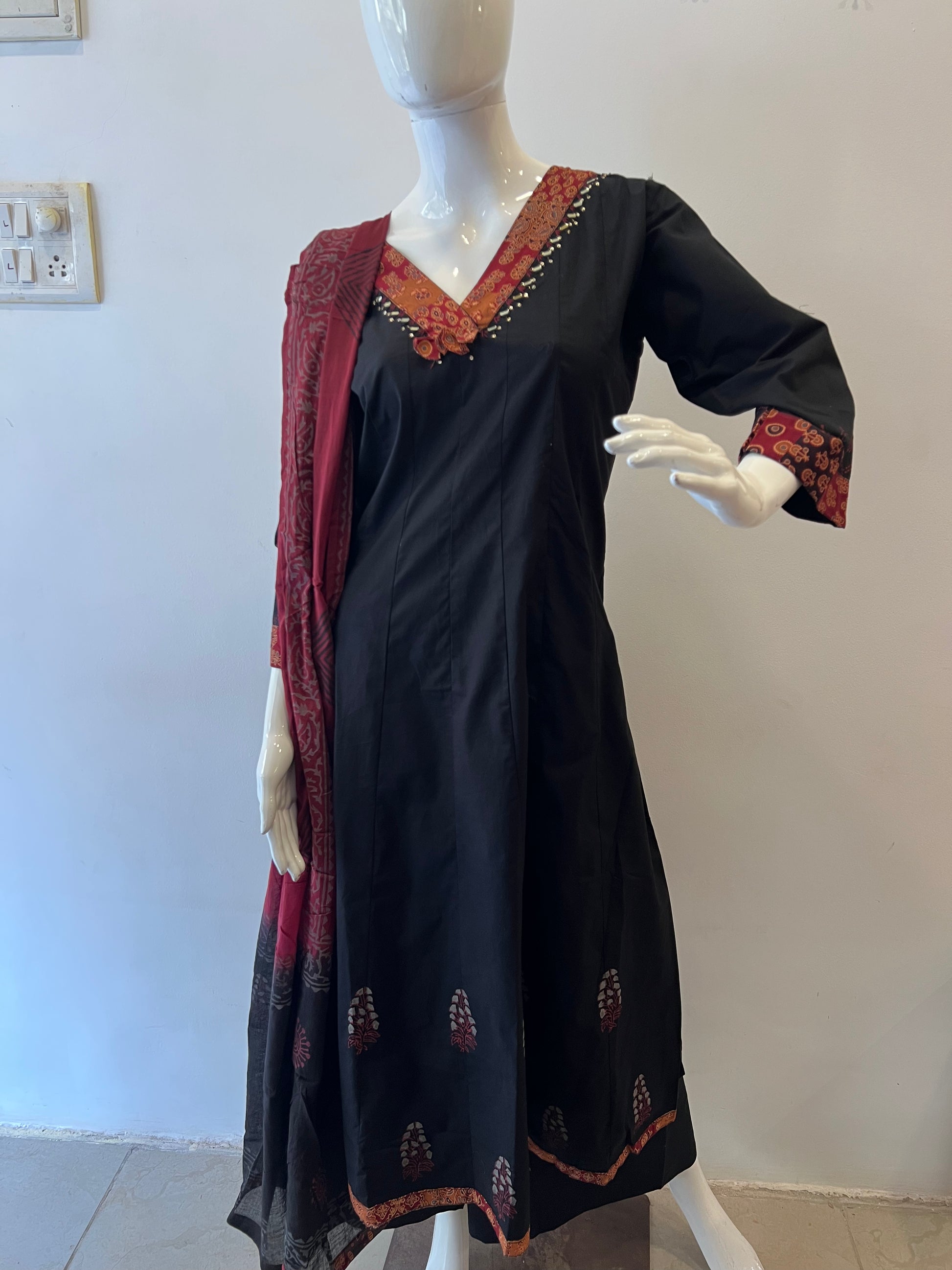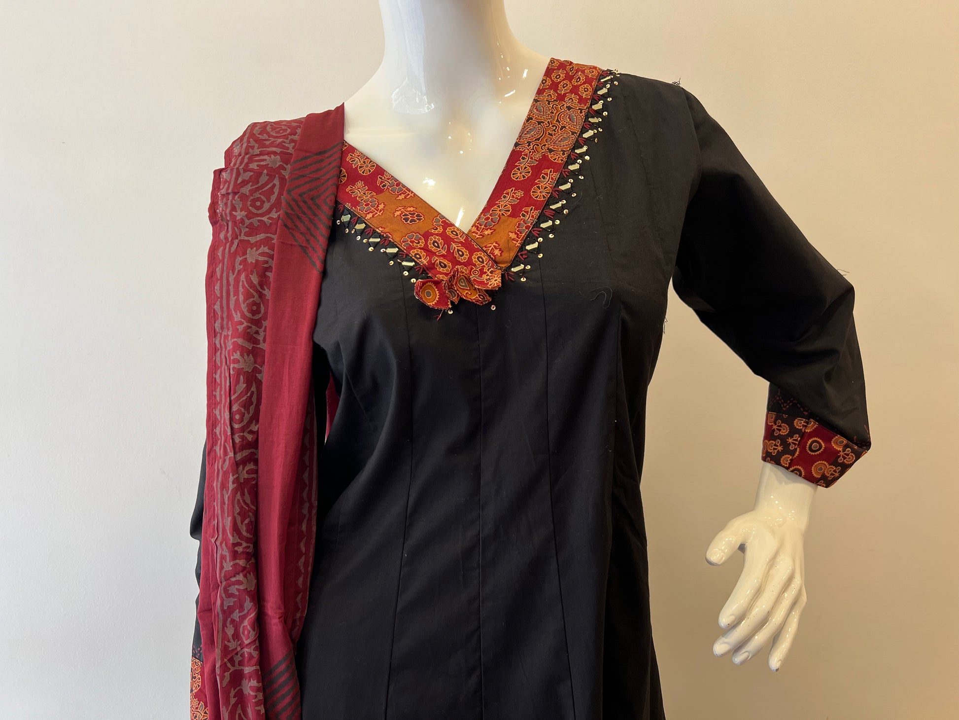 This exquisite ensemble features a sophisticated black kurta adorned with intricate burgundy and gold embellishments along the neckline and hemline. The complete set includes a kurta and a matching maroon dupatta with subtle traditional patterns.