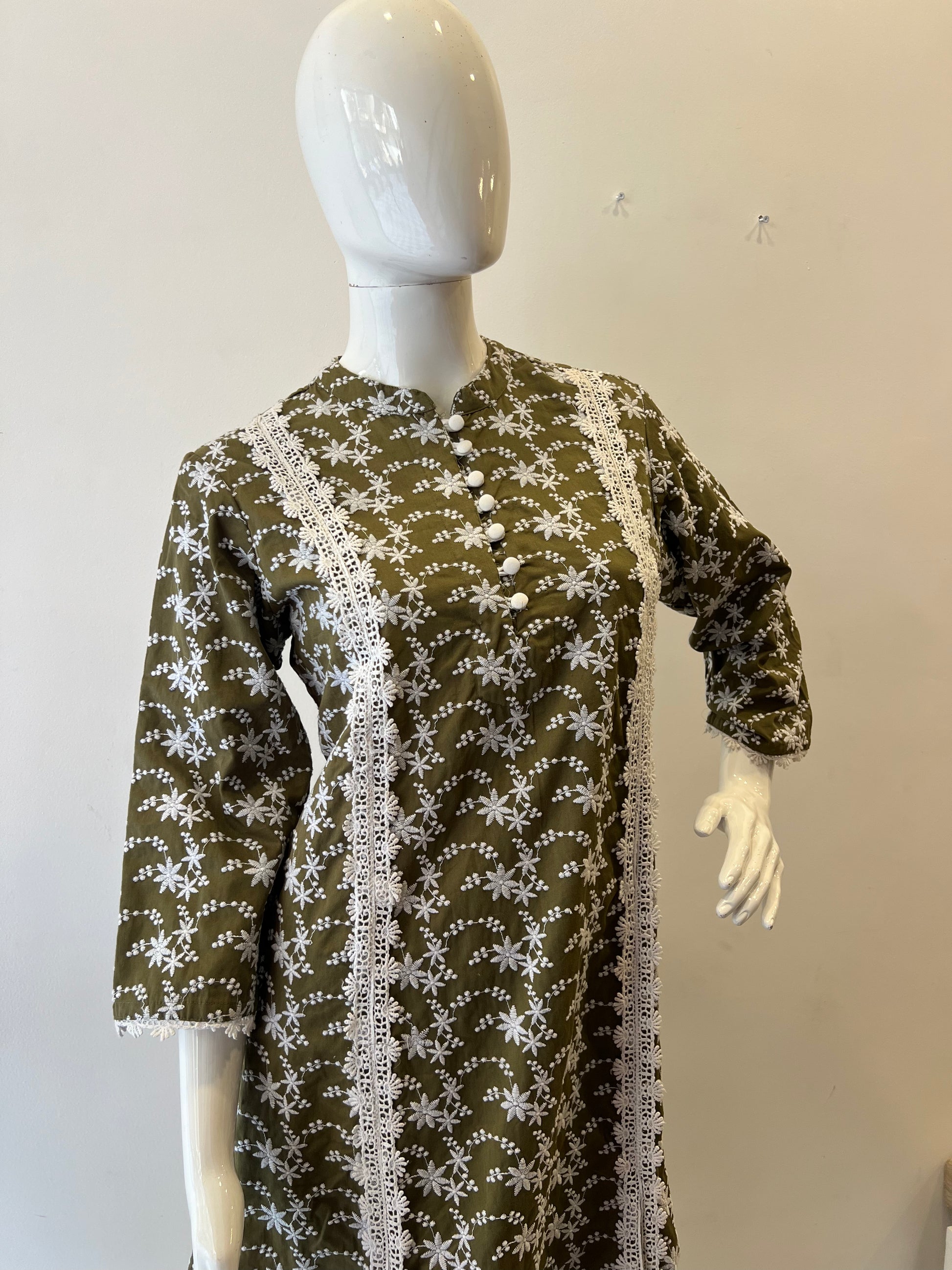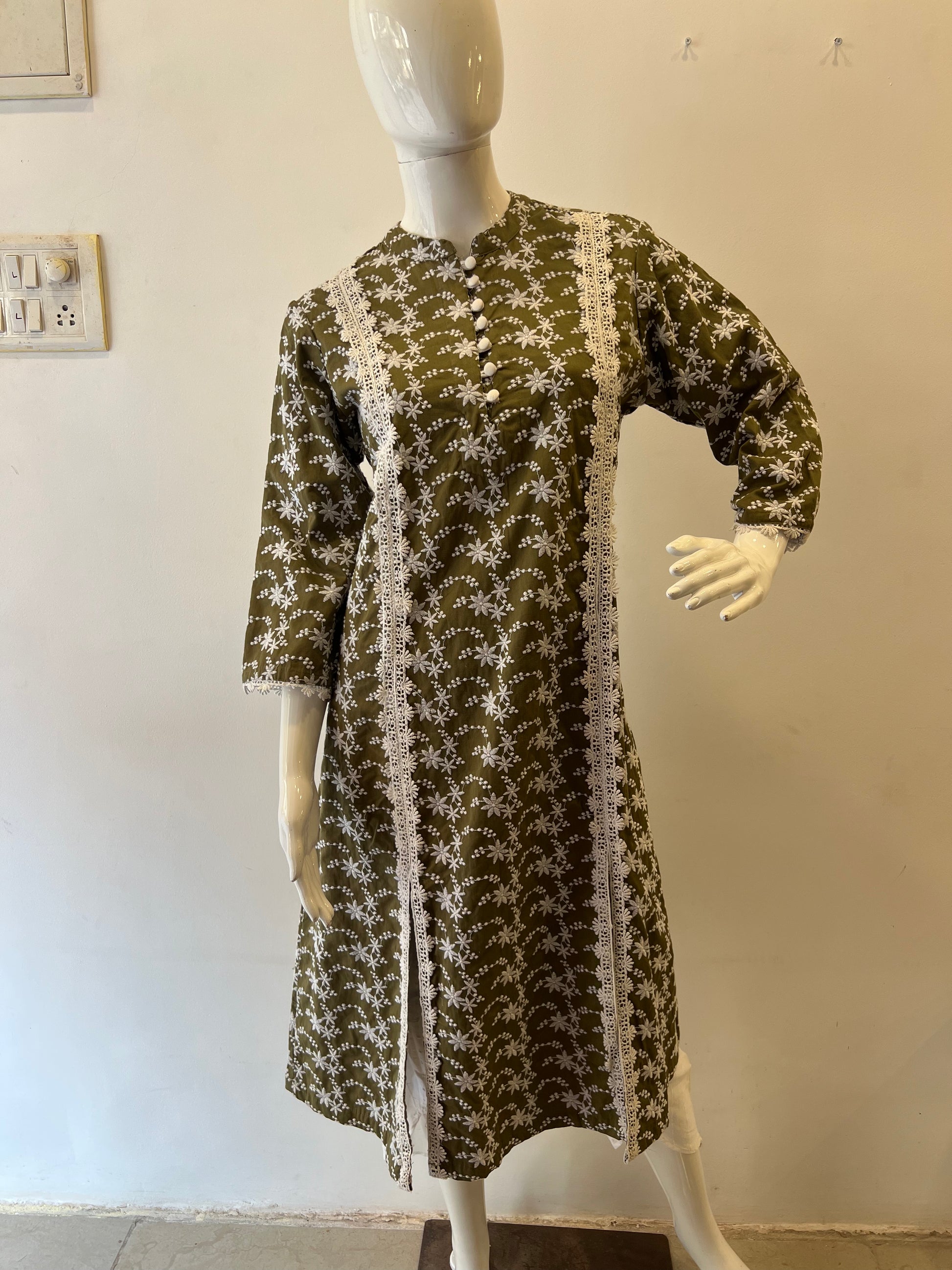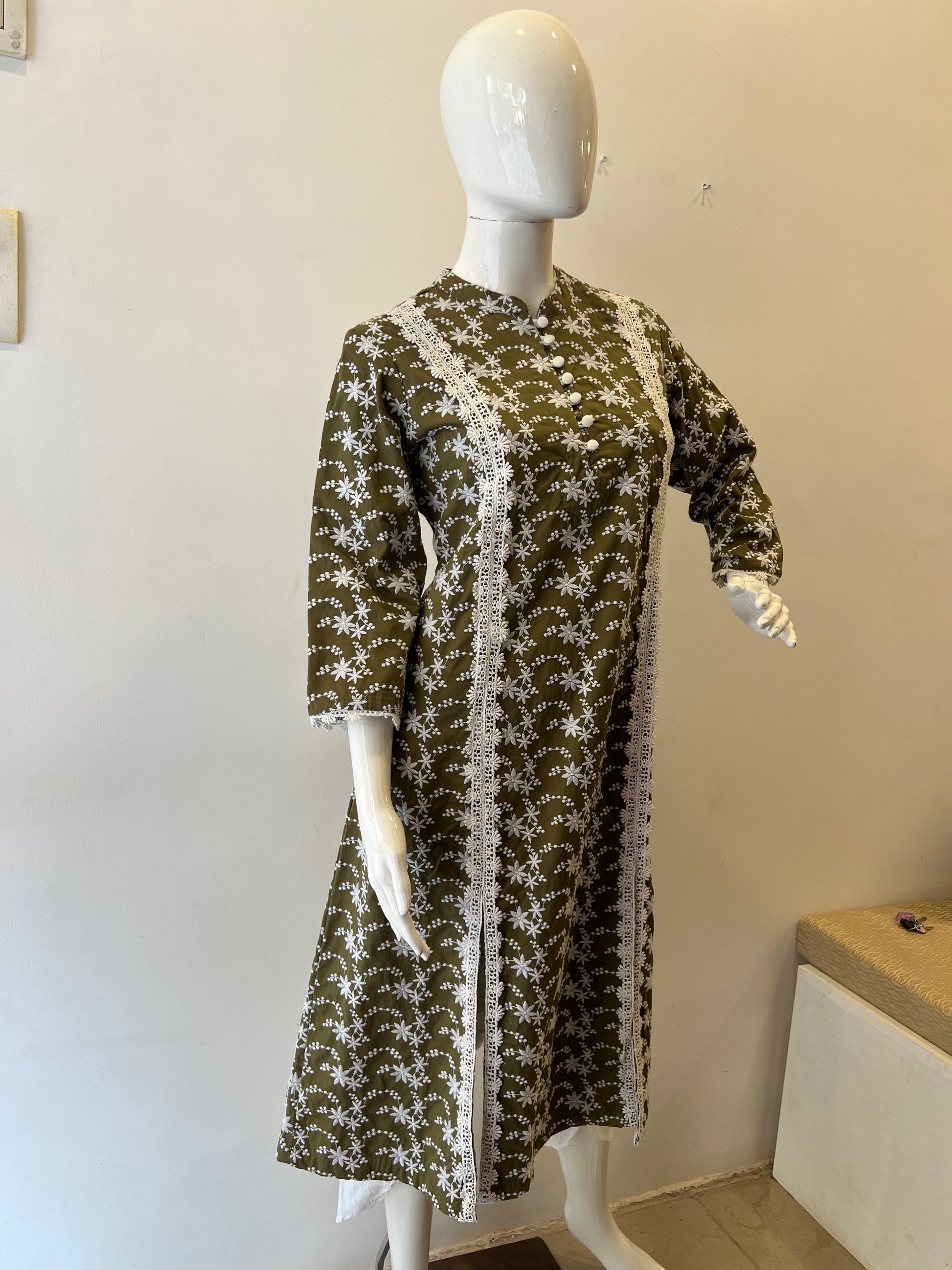 This elegant olive green cotton kurta features delicate white floral embroidery throughout the fabric, creating a beautiful contrast against the rich earthy background. The detailed design includes intricately embroidered white flowers and dotted patterns arranged in graceful waves across the garment.