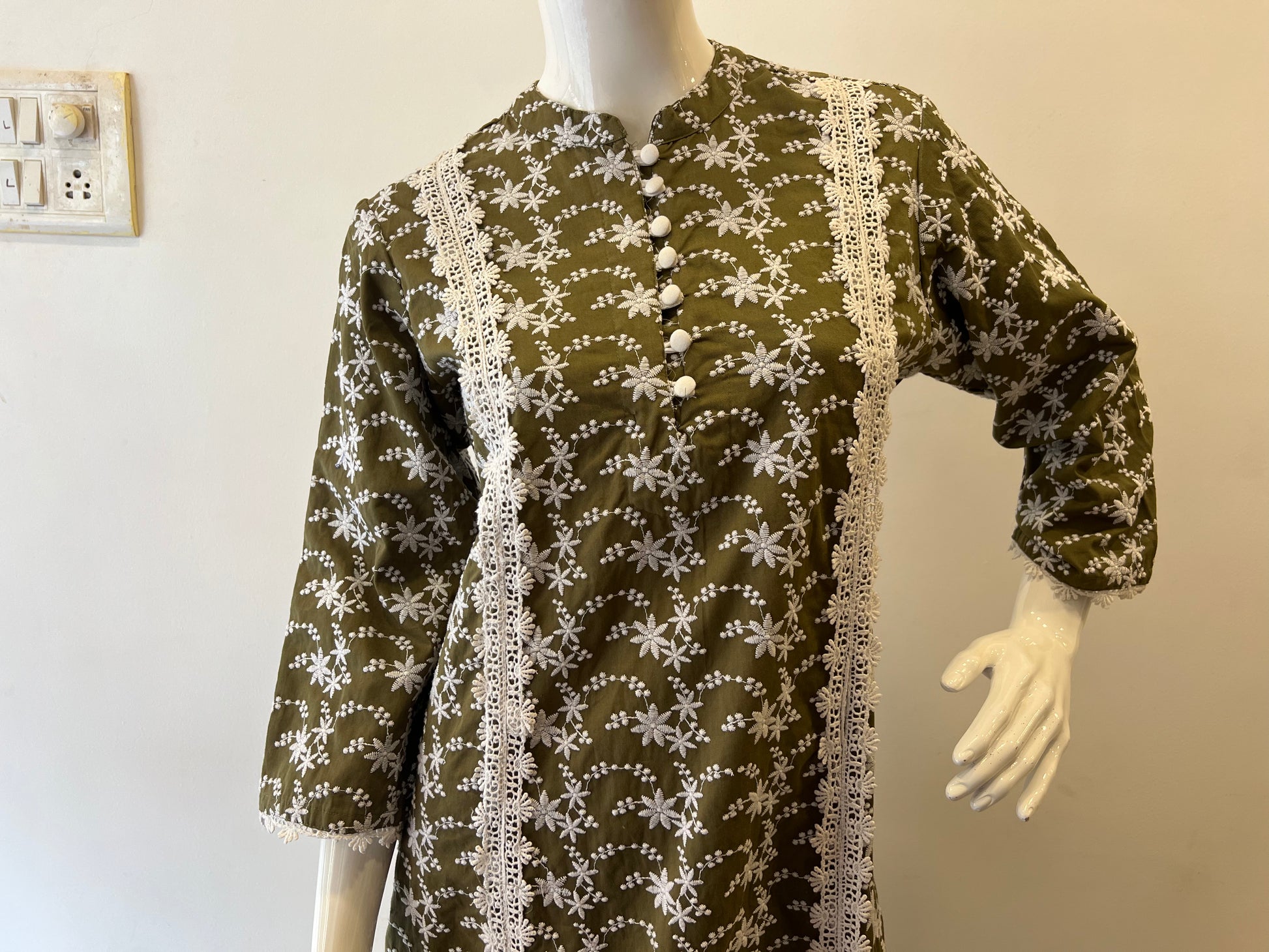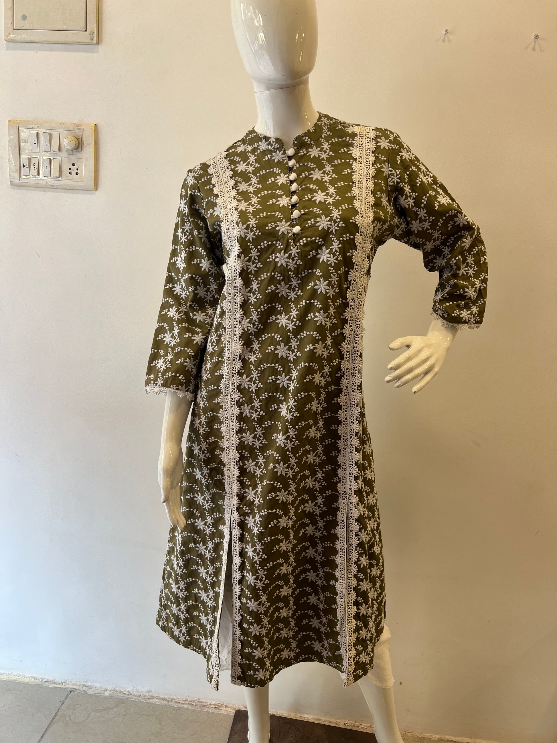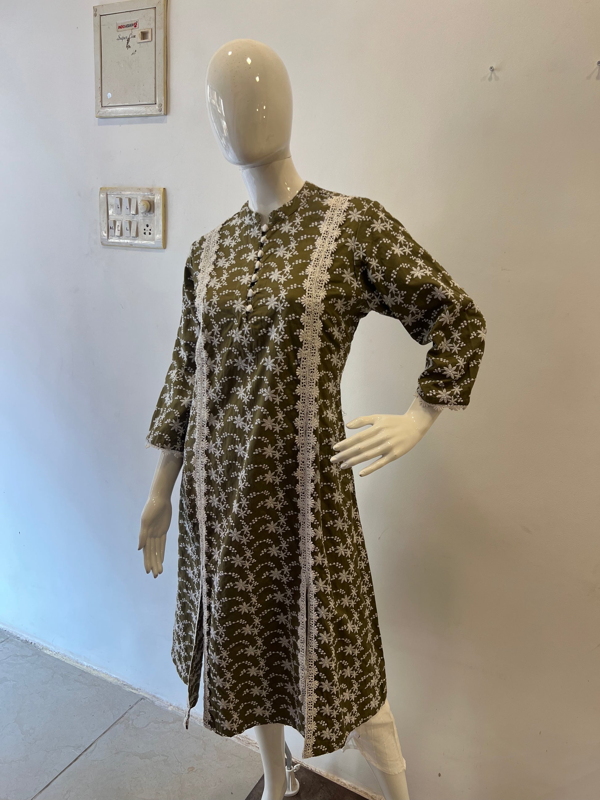 This elegant olive green cotton kurta features delicate white floral embroidery throughout the fabric, creating a beautiful contrast against the rich earthy background. The detailed design includes intricately embroidered white flowers and dotted patterns arranged in graceful waves across the garment.