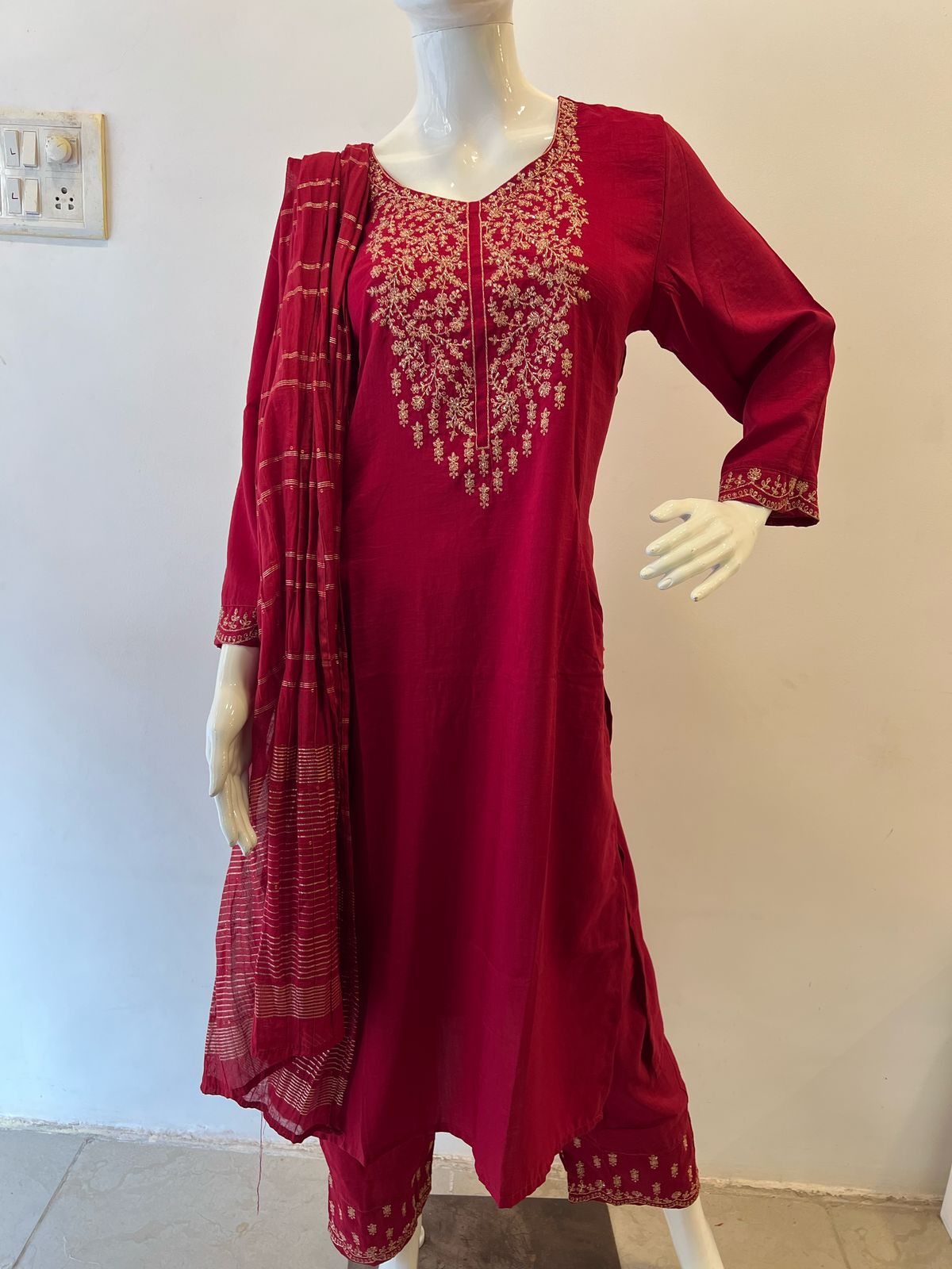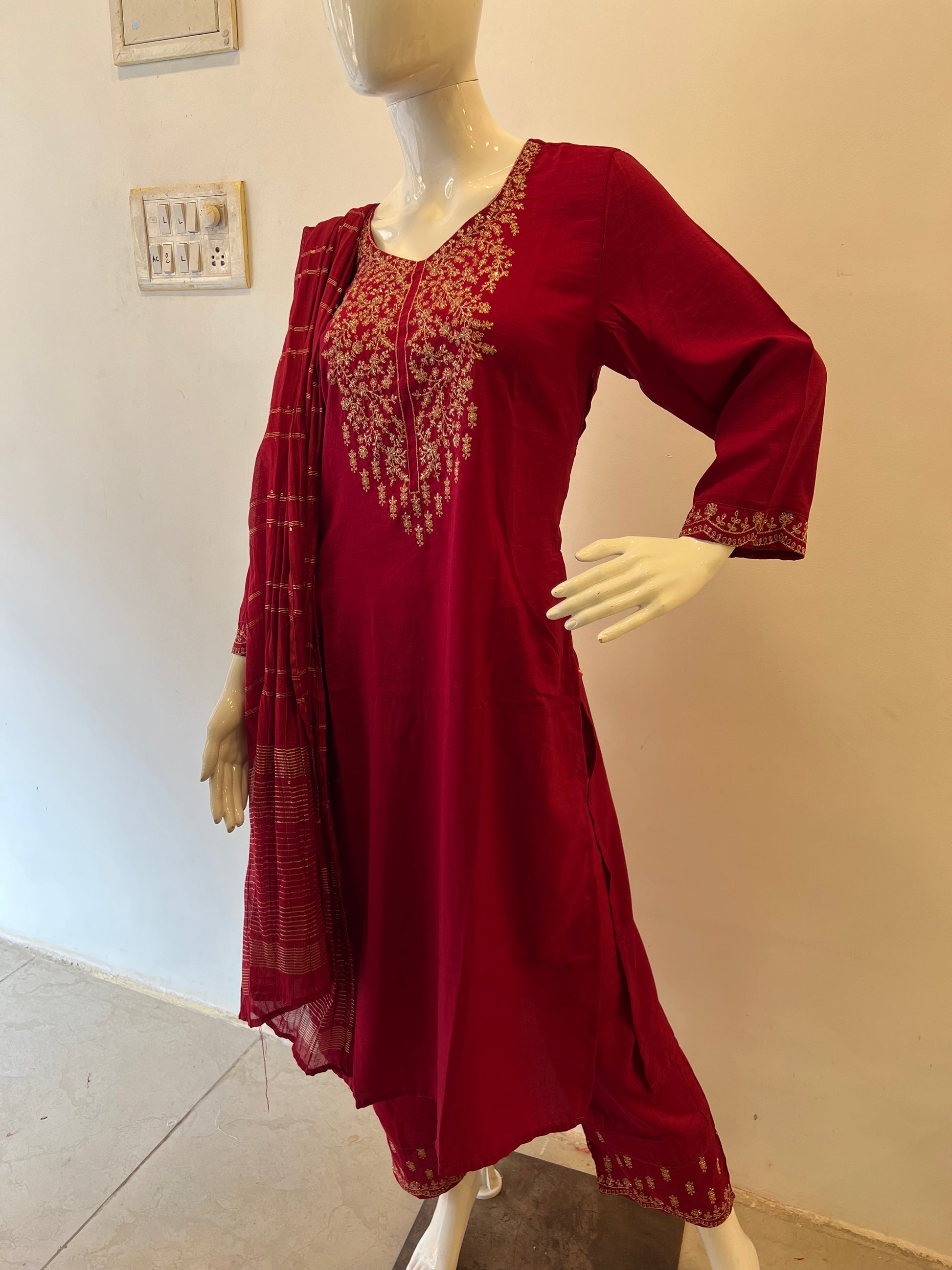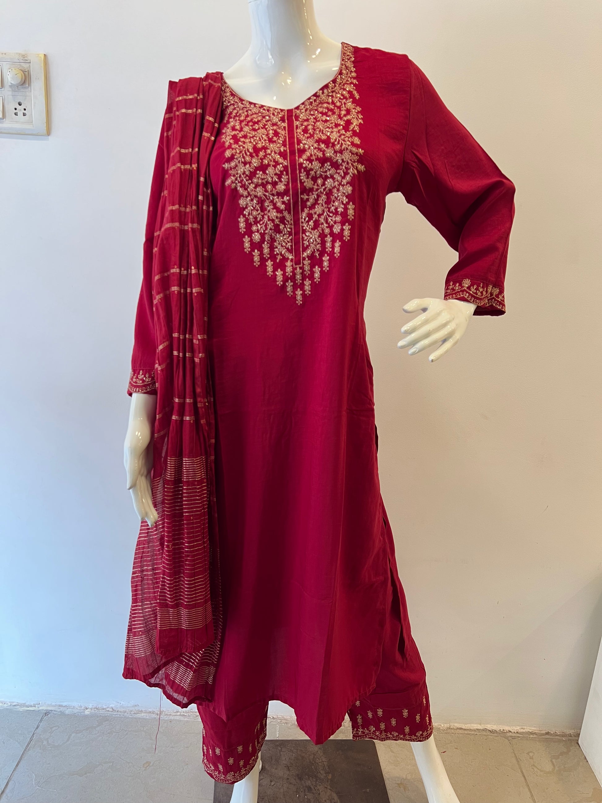 This luxurious ensemble showcases timeless elegance with intricate gold embroidery on a rich crimson backdrop, featuring a beautifully crafted kurta paired with matching bottoms and dupatta for a complete traditional look.