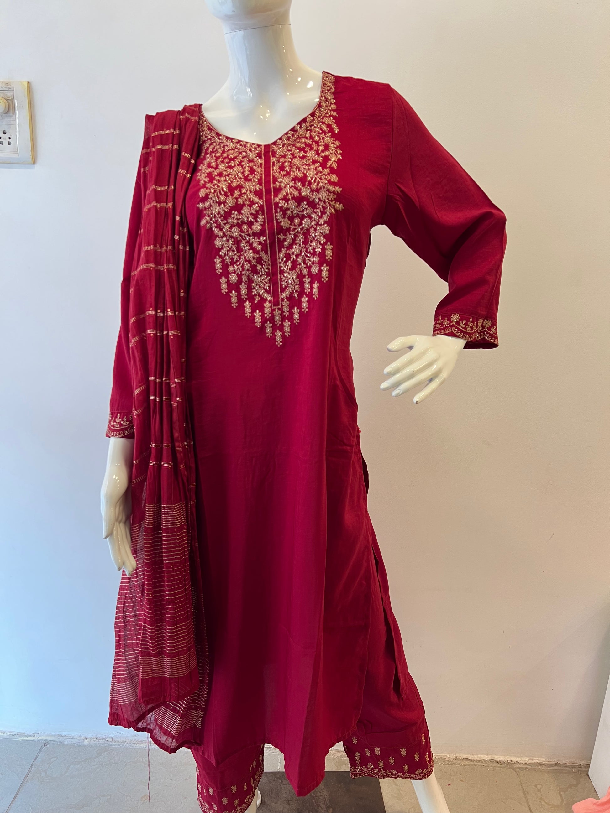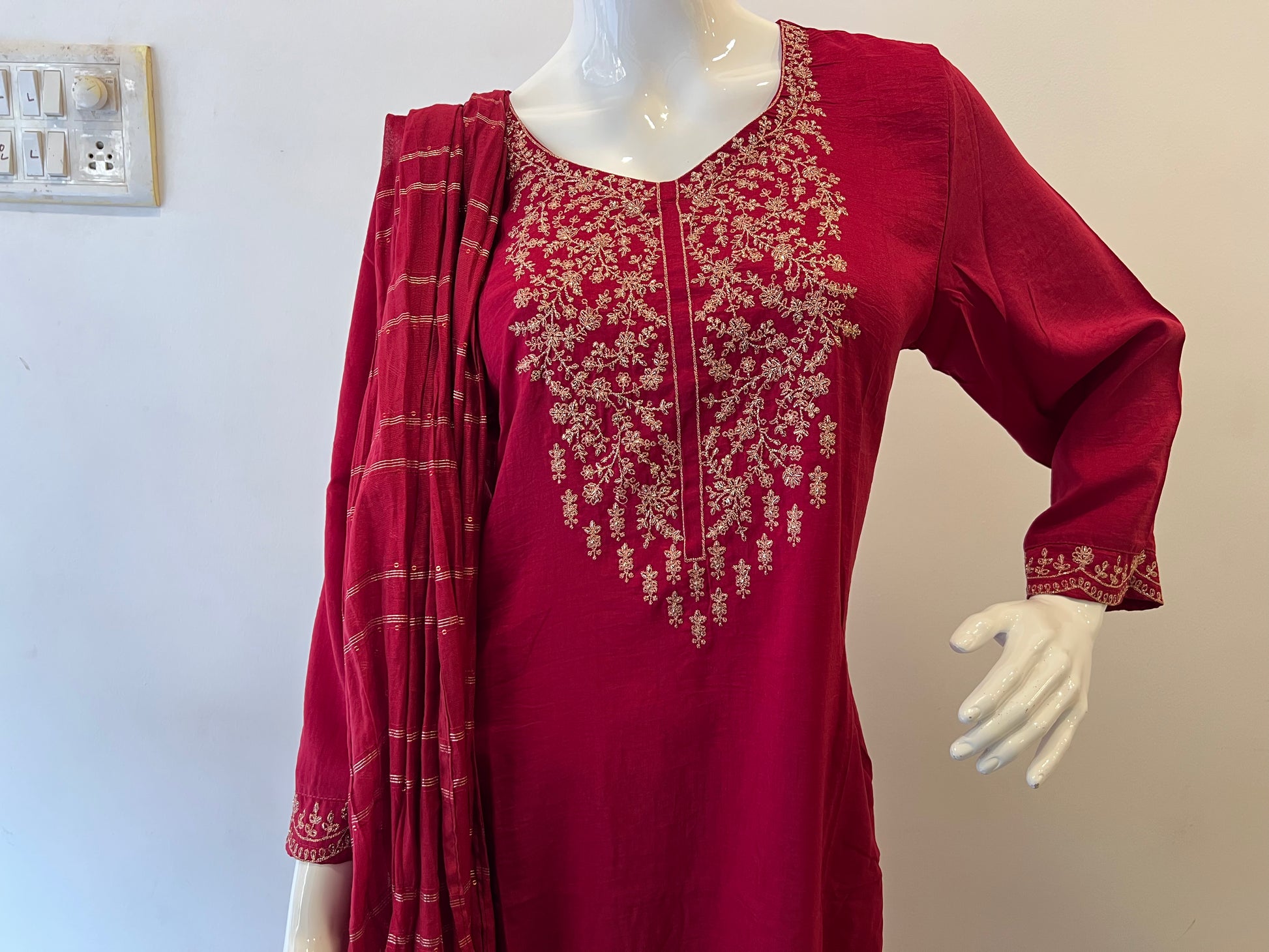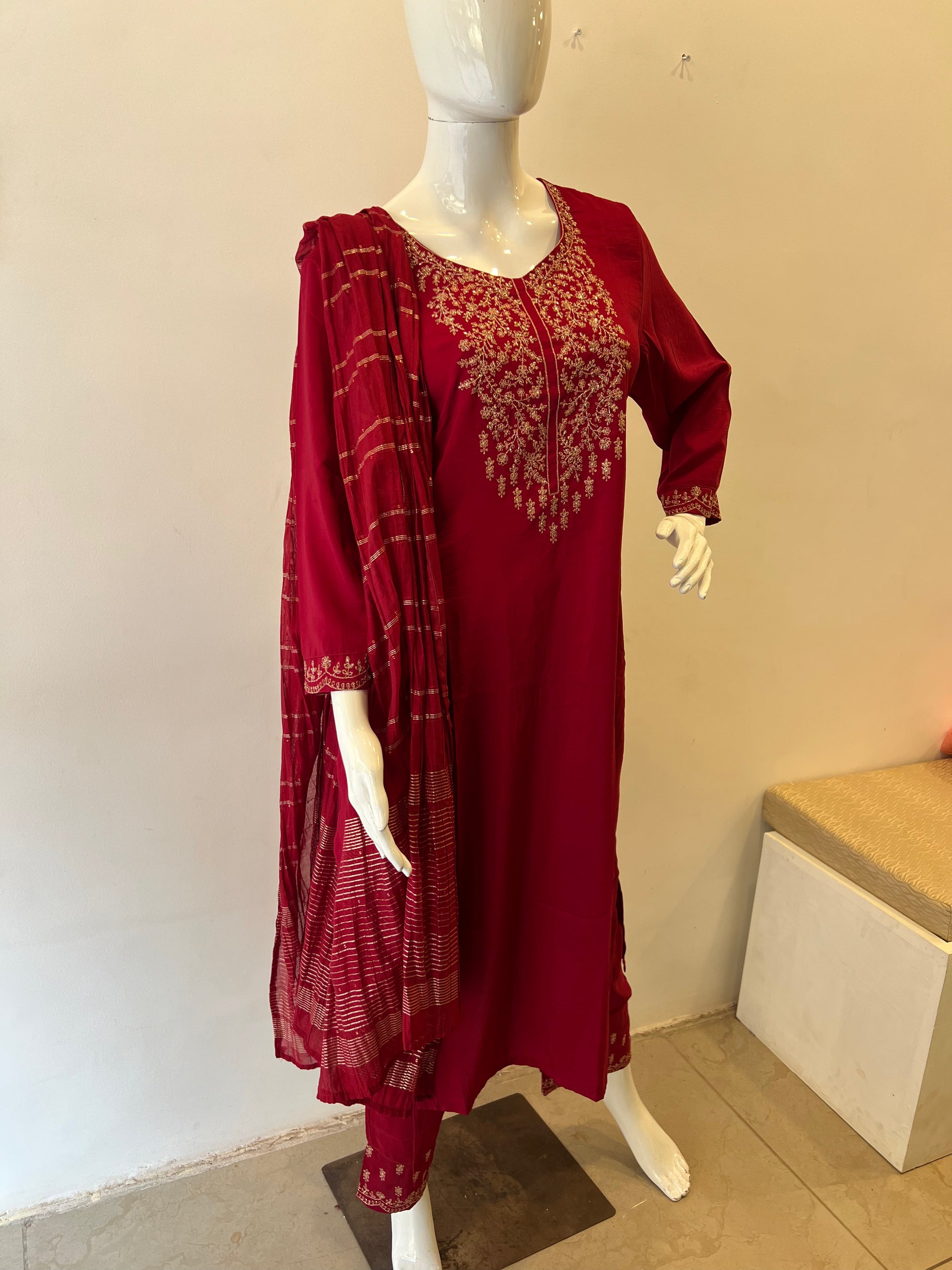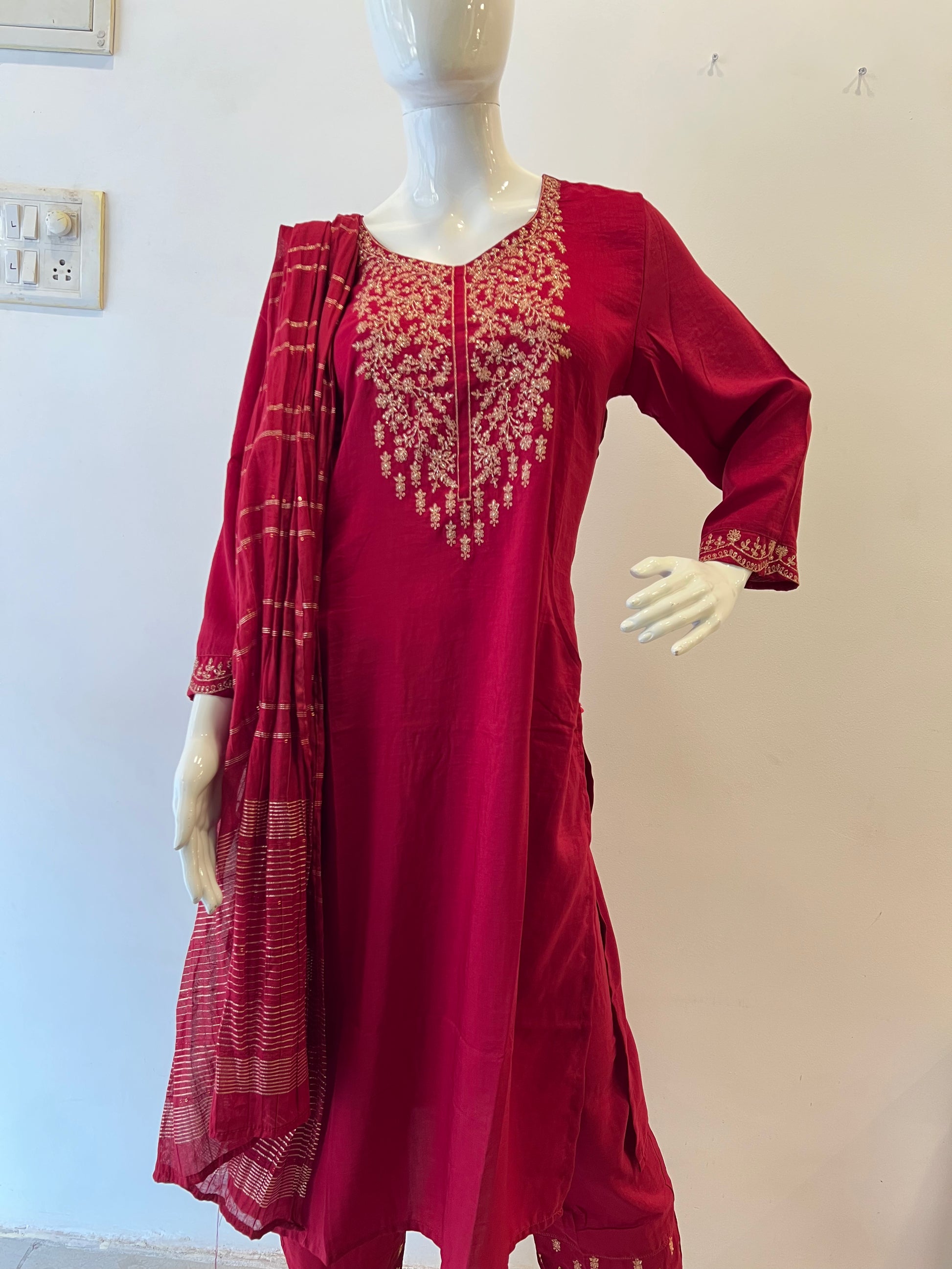 This luxurious ensemble showcases timeless elegance with intricate gold embroidery on a rich crimson backdrop, featuring a beautifully crafted kurta paired with matching bottoms and dupatta for a complete traditional look.